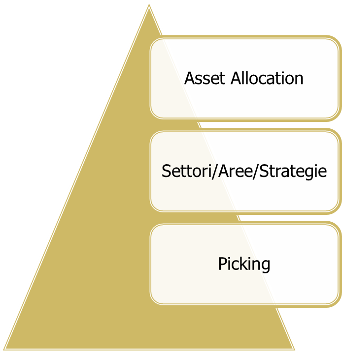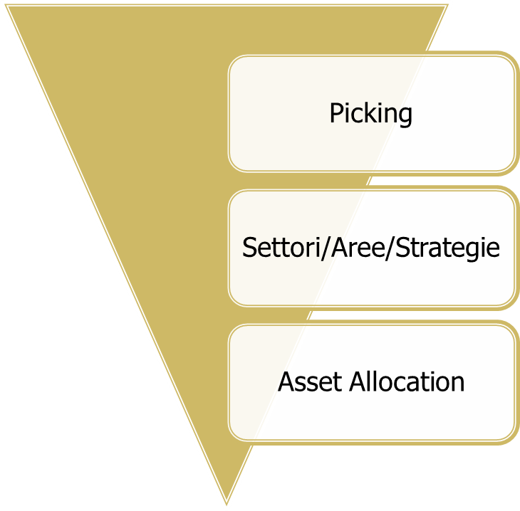 Da una parte l’approccio Top Down che, partendo dal generale, l’asset allocation tra le macro asset class, procede verso il particolare passando attraverso ripartizioni degli strumenti finanziari sempre più fini e giungendo infine alla scelta dei singoli prodotti (il cosiddetto picking).